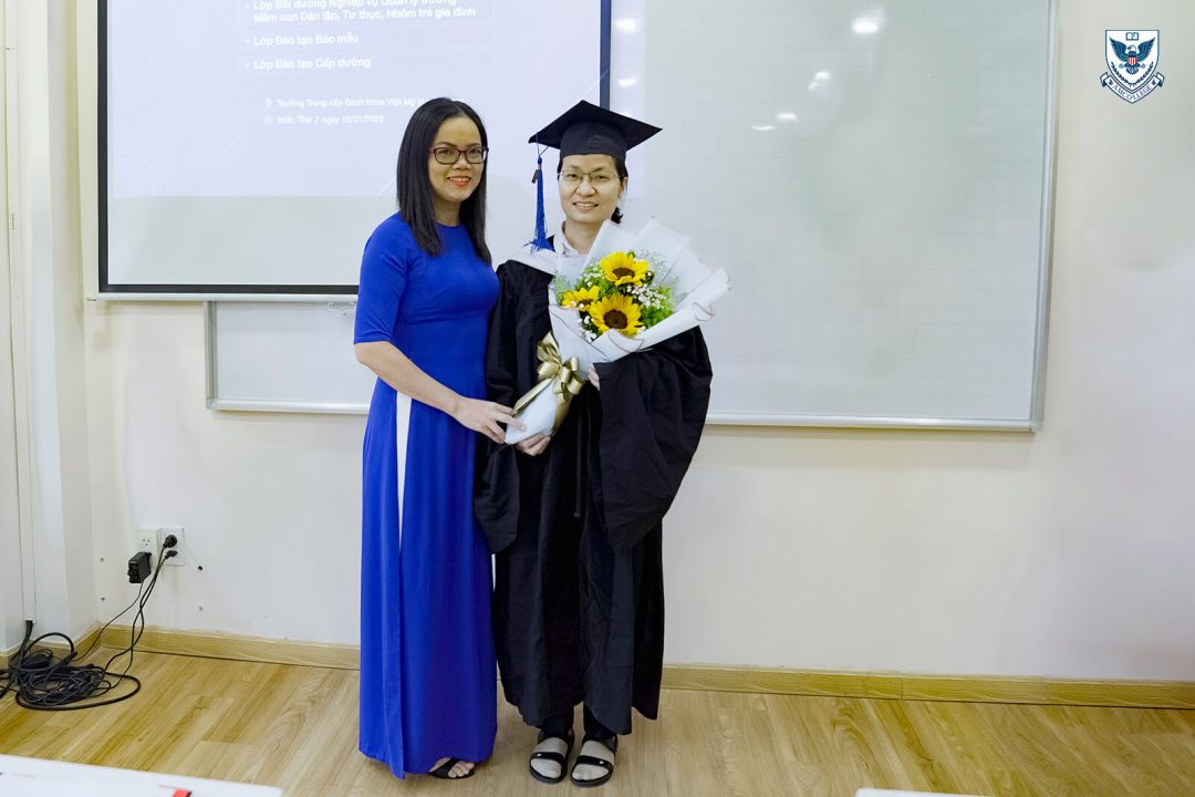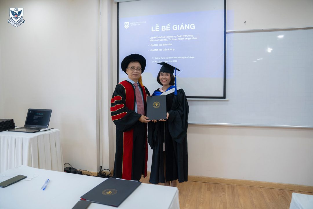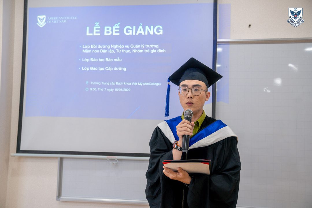 Sáng ngày 15/1/2022 vừa qua, trường Trung cấp Bách khoa Việt Mỹ (AmCollege) trực thuộc Hệ thống Phát triển Giáo dục quốc tế Đông Dương đã tổ chức buổi lễ bế giảng dành cho các học viên tốt nghiệp các khóa học ngắn hạn bao gồm Quản lý Mầm non, Đào tạo bảo mẫu, Đào tạo cấp dưỡng. Các bạn đã hoàn thành kỳ thi tốt nghiệp trực tuyến do AmCollege tổ chức vào cuối năm 2021 vừa qua và sẵn sàng khởi động hành trình công việc tương lai của bản thân. Buổi lễ bế giảng chính là cột mốc đánh dấu chặng đường mới trên hành trình đó.