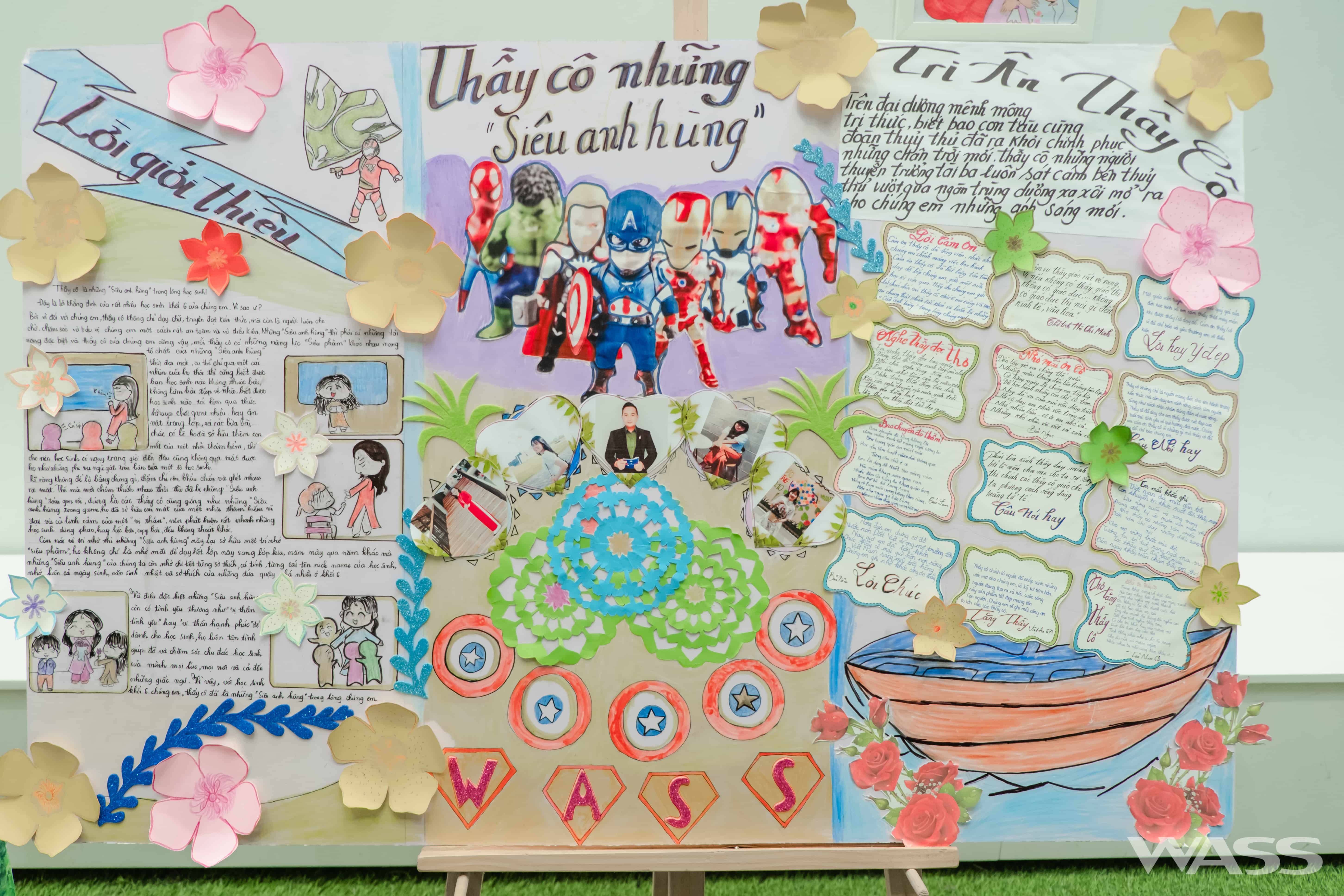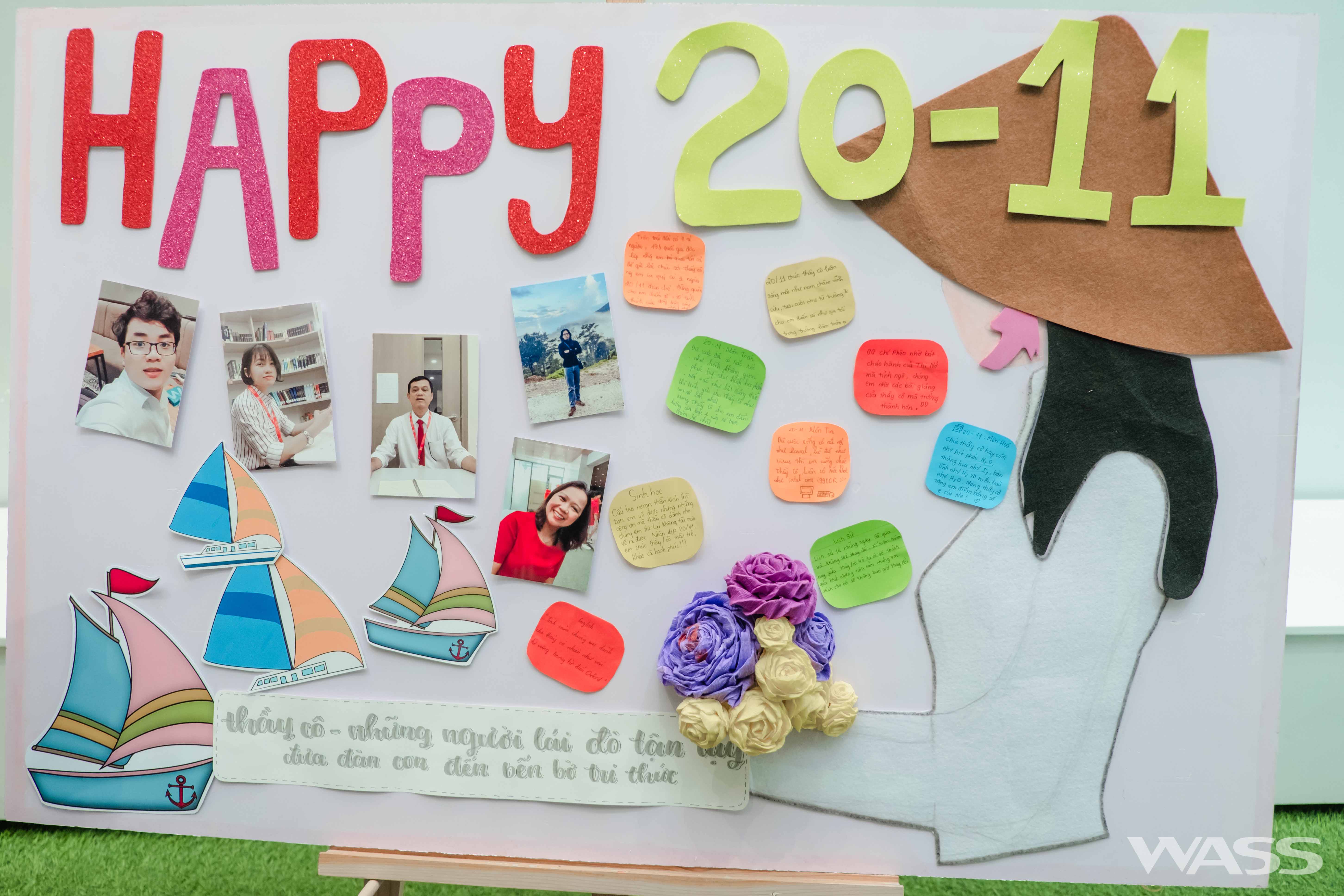 WASS đã tổ chức rất nhiều hoạt động thú vị để kỷ niệm ngày lễ đặc biệt này. Buổi triển lãm “có-một-không-hai” với những hình ảnh, câu chuyện vui nhộn của giáo viên chủ nhiệm các lớp, giáo viên bộ môn và các thầy giám thị được chính WASSers kỳ công chuẩn bị. Thông qua bộ stickers cảm xúc được chuẩn bị sẵn tại khu vực trưng bày, các em học sinh đã thể hiện rất nhiều tình cảm đối với các thầy cô mình yêu quý.
